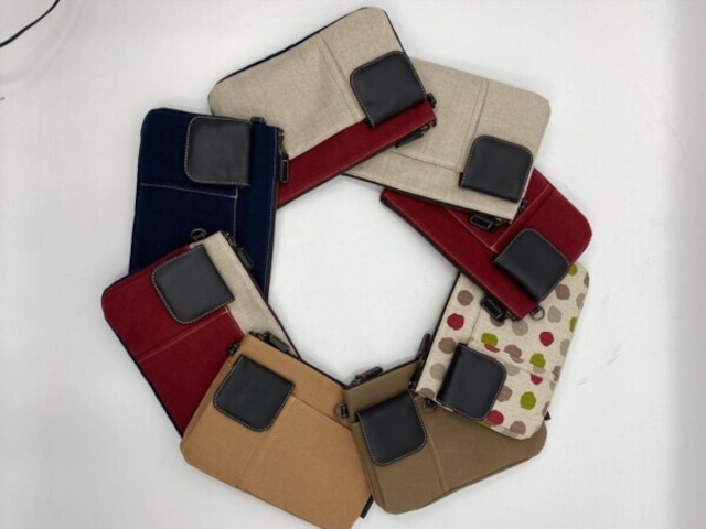 楽居布のバッグといえば、このポケットショルダーを思い浮かべてくださる方も多いはず。ミニポケットショルダーバッグは楽居布ブランド発足当初から、変わらないデザインと使い勝手の良さで長く愛されています。 変わらないデザイン・・といいましたが、大きめのスマートフォンを入れても、まだお財布や手帳も入るゆとりのあるサイズに進化しています。 「今の暮らしに合うか」を考え、より使い勝手が良いように工夫し続けています。 温かみのある「シンプル」はいまも変わらずにいられるのは、各地域で丁寧に染め上げ紡がれたものを使わせていただいているからでしょうか。 メイドインジャパンの独特な色味や手触りは、他にない安心感と温もりを伝えてくれます。 楽居布の暮らしへのこだわりが形となって愛され続けている、ミニショルダーバッグです。 ①柿渋染:表地/綿100%・裏地/綿100%・持ち手/牛革 ②綿麻水玉:表地/綿50%麻50%・裏地/綿100%・持ち手/牛革 他 ③綿麻キカ柄:表地/綿50%麻50%・裏地/綿100%・持ち手/牛革 他 ④リネンちりめん(紺):表地/麻100%・裏地/綿100%・持ち手/牛革 他 サイズ:約27×19㎝