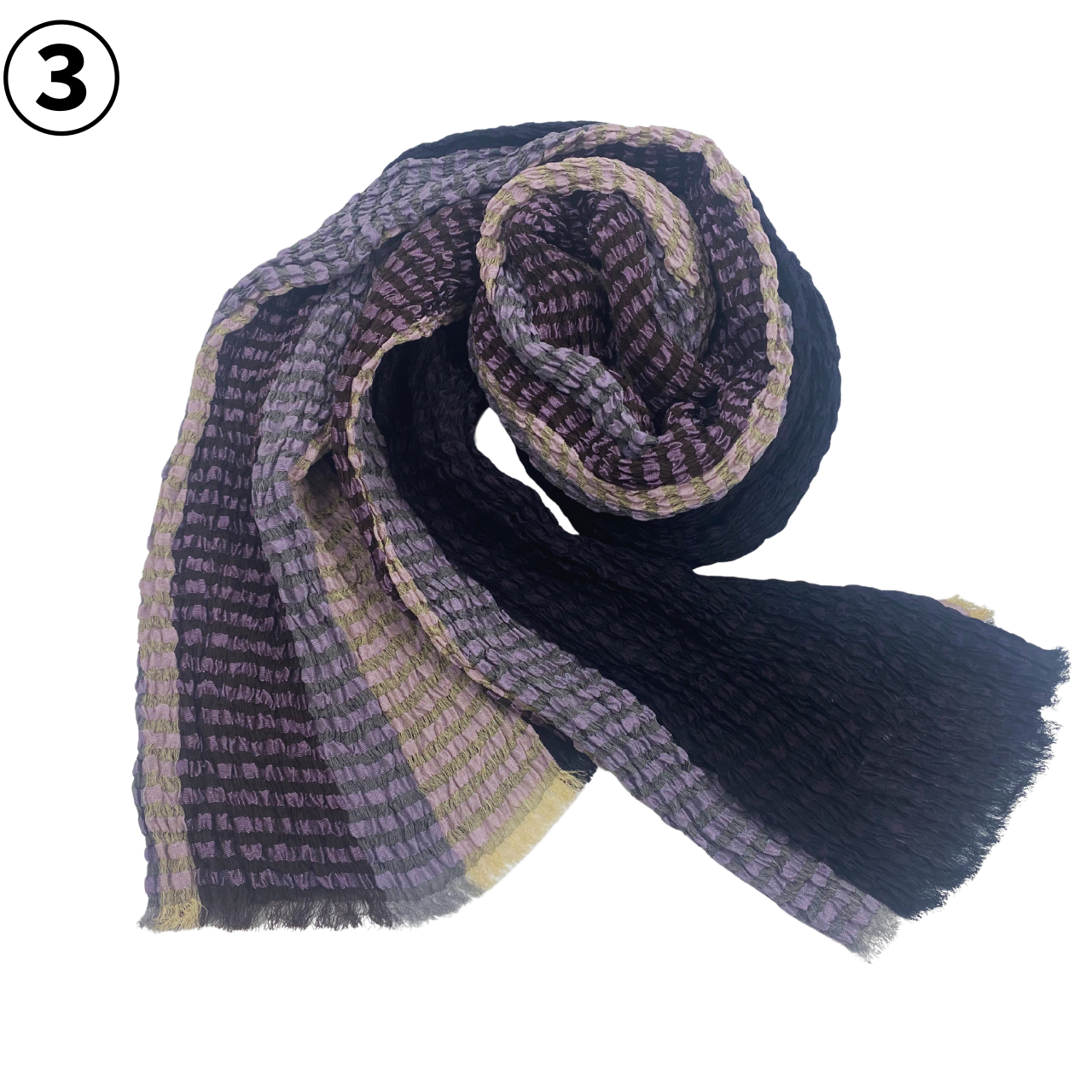 秋冬:チューブ状に織られているので空気が含まれ、シルクの”保湿効果”も相まって、冬場は大変暖かい!ウール素材がチクチクする方にとっても、身につけやすいです。